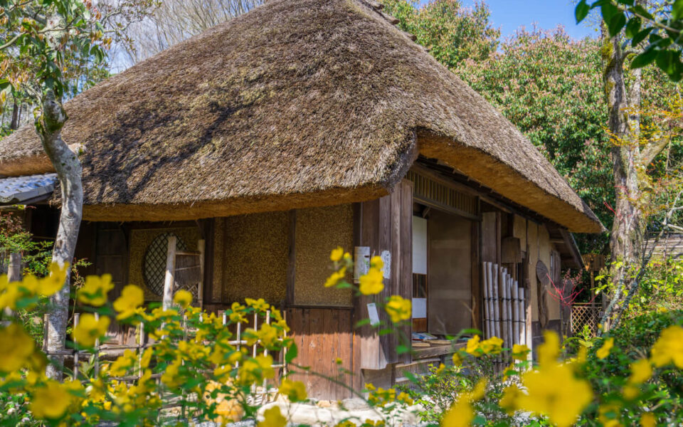 現在の落柿舎は1770年に再建されたものですが、生垣に囲まれた藁葺きの草庵は柿木や草花、句碑がお庭に点在しており、当時の風景を再現しています。
